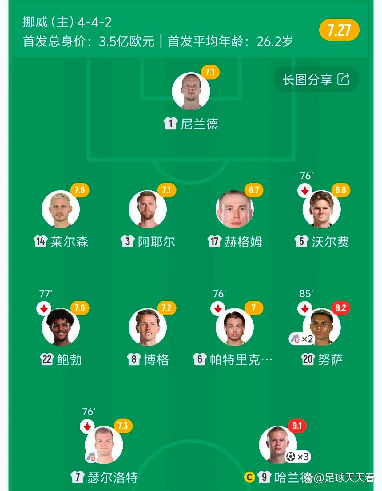 厄德高在伤愈复出后,将毫无疑问地担当起挪威队中场核心的重任(身价八千万欧元),他将顶替帕特里克的位置。另外三位中场球员的身价分别为鲍勃(三千万欧元)、博格(二千五百万欧元)和努萨(二千八百万欧元)。尽管挪威队的后防线名气稍显不足,但效力于多特蒙德的莱尔森(二千万欧元)、效力于布伦特福德的阿耶尔(一千六百万欧元)、效力于博洛尼亚的赫格姆(七百五十万欧元),以及效力于狼队的沃尔夫(一千二百万欧元),他们全部效力于欧洲五大联赛,实力不容小觑。唯一略显逊色的,或许是三十五岁的门将尼德兰(身价仅九十万欧元),他效力于塞维利亚,并非球队主力,这算得上是一个相对的短板。