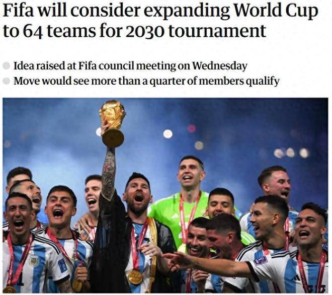面对国足目前的实力状况,有分析指出,想要圆梦世界杯,或许只能寄希望于国际足联的进一步扩军。今年3月,《》曾披露一则重磅消息:国际足联正考虑在2030年世界杯百年庆典之际,将参赛队伍再次扩增至64支。据悉,这一大胆提案最初由南美某足协提出。