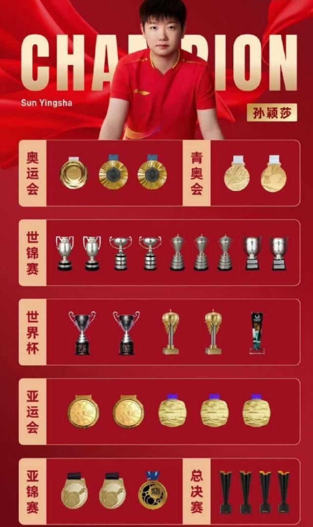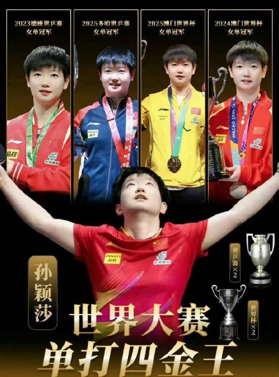 2025年孙颖莎包揽世乒赛女单、混双(搭档王楚钦)及世界杯女单冠军,成为乒坛首位实现世乒赛双圈金满贯的女子运动员。全年斩获单打六冠,外战61场全胜,终结日本选手桥本美和11连胜国乒纪录。