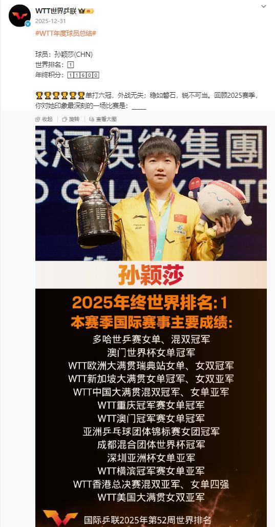 12月31日WTT官方也晒出了孙颖莎整个2025赛季的荣誉,他拿到了世界杯女单冠军、世乒赛女单冠军,单赛季有6个单打冠军,孙颖莎也蝉联女单世界第一的席位,外战无失更是炸裂。