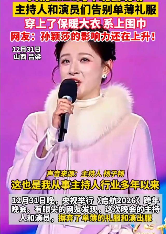 北京时间1月1日,根据《宁波晚报》的消息,央视2026年跨年晚会主持人们告别了单薄礼服穿上了保暖大衣系上围巾,网友们纷纷盛赞孙颖莎的影响力还在提升。