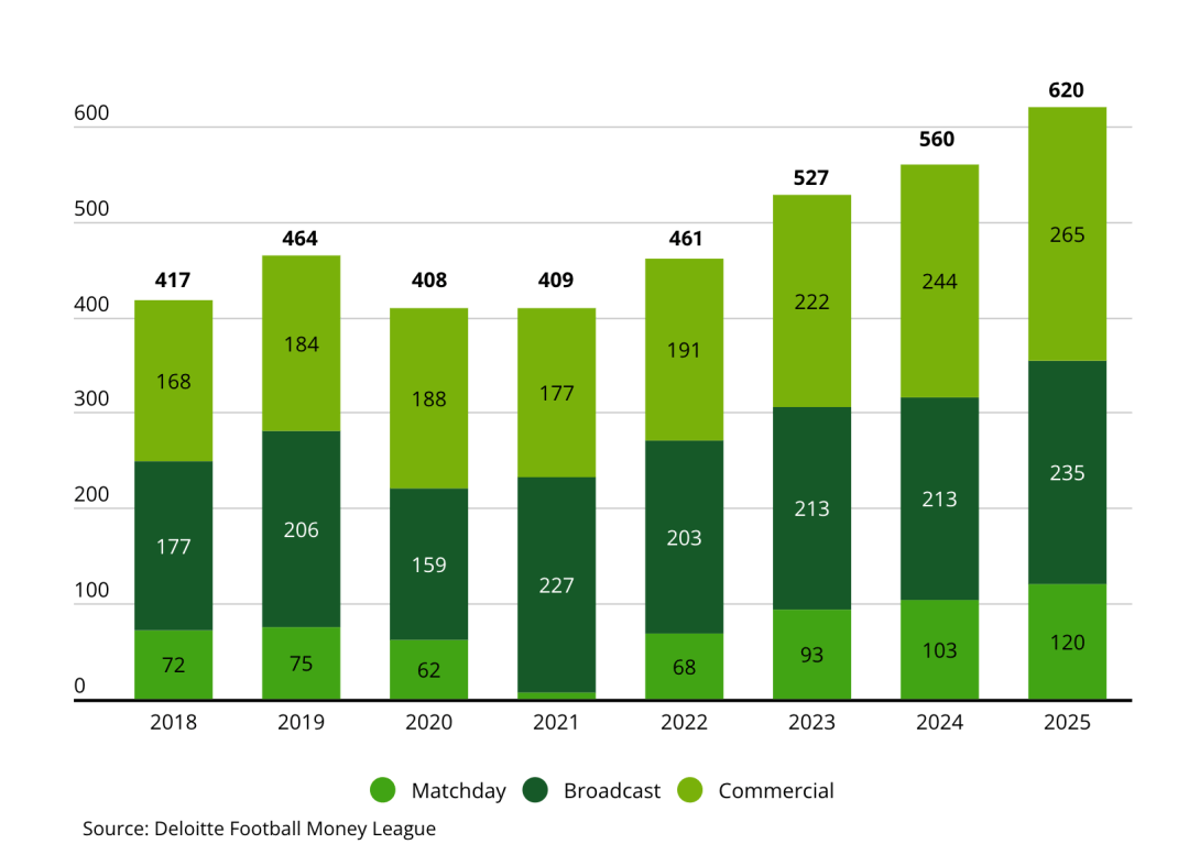 财富榜数据显示,该赛季的比赛日收入创下24亿欧元的历史新高,连续第四年成为财富榜中同比增长率最高的收入来源(16%)。德勤指出,俱乐部在提升比赛日体验方面加大投入,同时运用个人座位许可证等创收手段,是推动这一增长的关键因素。