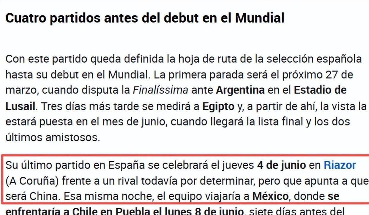 消息是2026年2月12日从西班牙传过来的。《马卡报》在体育版块透露,为了备战马上就要开打的美加墨世界杯,西班牙队计划在6月份安排两场热身赛。其中一场对手已经敲定,是南美劲旅智利,比赛放在墨西哥的普埃布拉。而另一场,也就是6月4日在他们自己家门口拉科鲁尼亚踢的那场,潜在的对手名单里,赫然写着中国男足的名字。