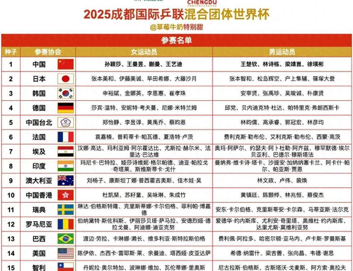 除了中日两强之外,其他队伍也虎视眈眈。作为连续两届混合团体世界杯亚军得主,韩国队本次同样由张禹珍、申裕斌等名将领衔出战,这支队伍整体实力均衡,团队配合默契,其混双组合经验丰富,是重要的得分保障。德国队则凭借邱党、杜达、弗朗西斯卡等男线悍将,加上近期表现突出、世界排名跃居欧洲女单第一的莎宾·温特,形成了一支更为均衡的队伍。此外,法国队的勒布伦兄弟和袁嘉楠,印度队层出不穷的“怪拍手”,以及中国香港队黄镇廷与杜凯琹的默契配合,都具备冲击强队的实力,随时可能带来意想不到的惊喜。