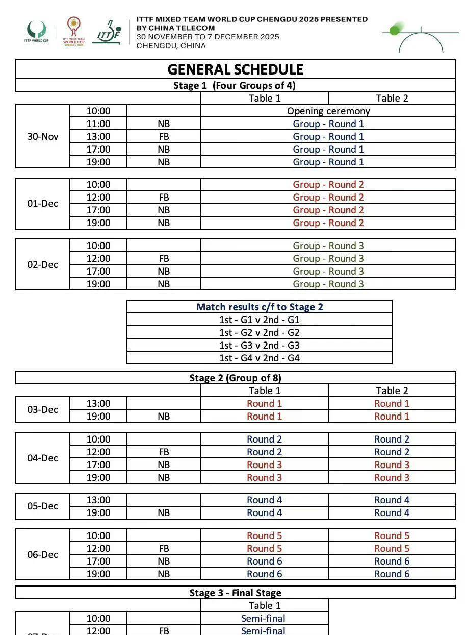 本次比赛采用独特的“局8胜制”,每场团体赛按照混双、女单、男单、女双/男双的顺序进行,每个单项必须打满三局,先累计赢得8局胜利的队伍即获得整场比赛胜利。这意味着,即使一支队伍在混双项目中取得2-0领先,双方选手仍需进行第三局比赛。这种赛制设计显著增加了比赛的局数,对运动员的体能储备提出了更高的要求。另一项重要规则是,参加混双比赛的选手不能在同一场比赛中再出战单打项目。这条规定迫使各队必须更深入地挖掘阵容潜力,无法再依赖一两位核心球员“包打天下”。值得一提的是,排名较低的队伍还有权决定双打比赛中是先进行男双还是女双,这无疑为弱势队伍提供了战术调整的空间。